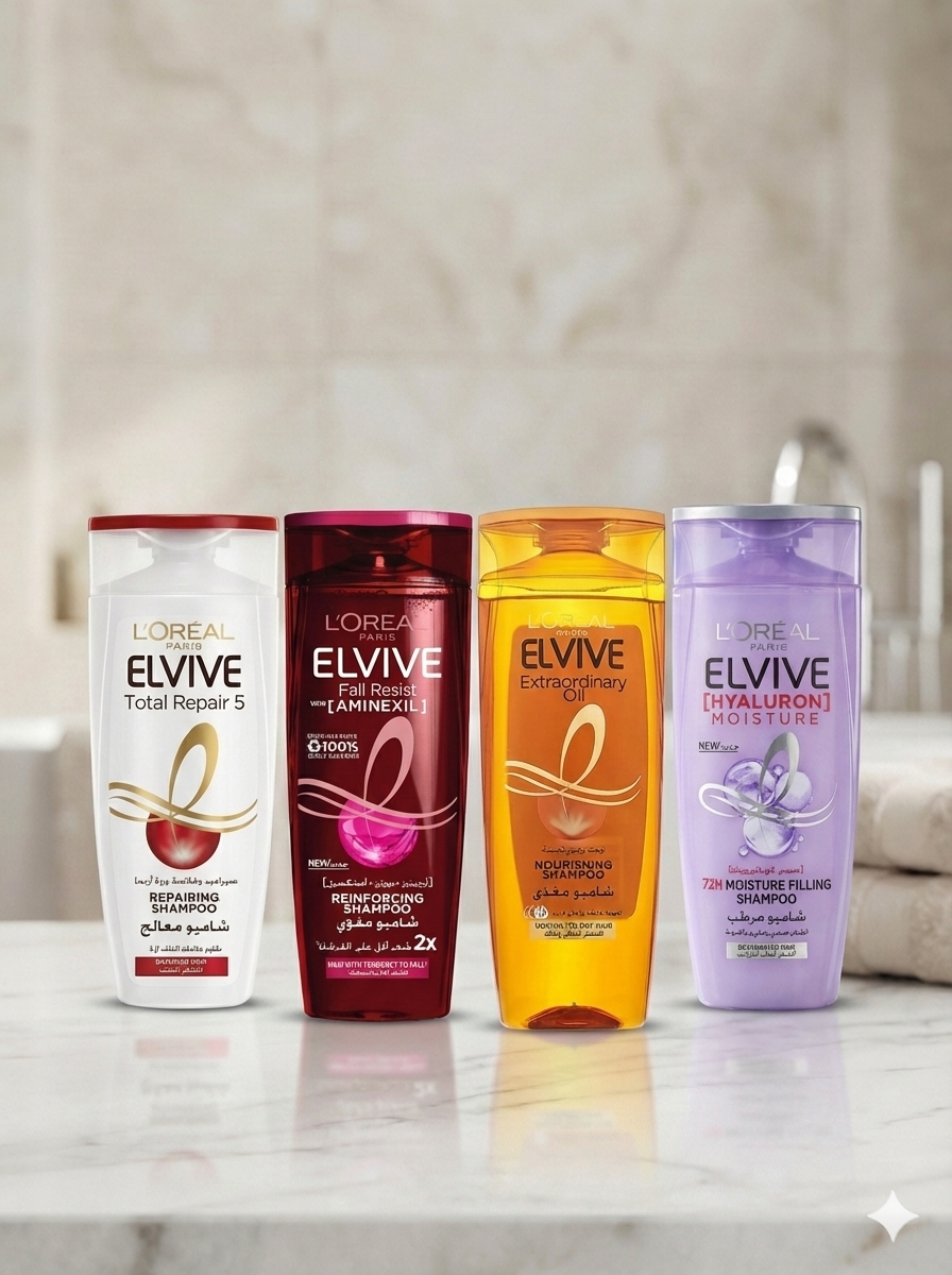 شامبو لوريال إلفيف لتقوية الشعر، تقليل التساقط، ترطيب عميق وإصلاح التلف، لنعومة ولمعان صحي يناسب كل أنواع الشعر.